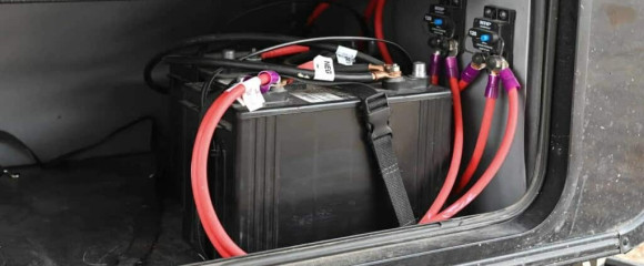 Is it safer to disconnect an RV battery while plugged into shore power, or is it better to keep it connected to the power grid?