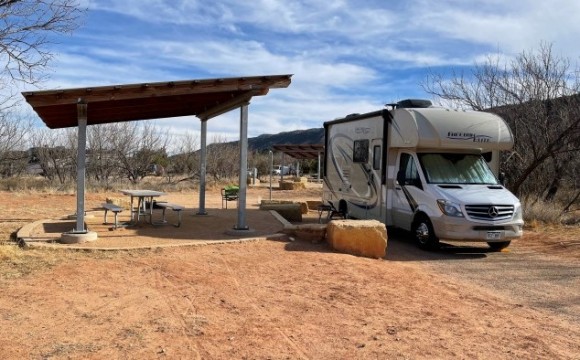This is an excellent find! The campgrounds are at the bottom of the canyon so the views are spectacular. Water and 30/50 amp electric and each site has a fire ring and picnic table with a shade roof over it. There was some ATT service as well (no wif...